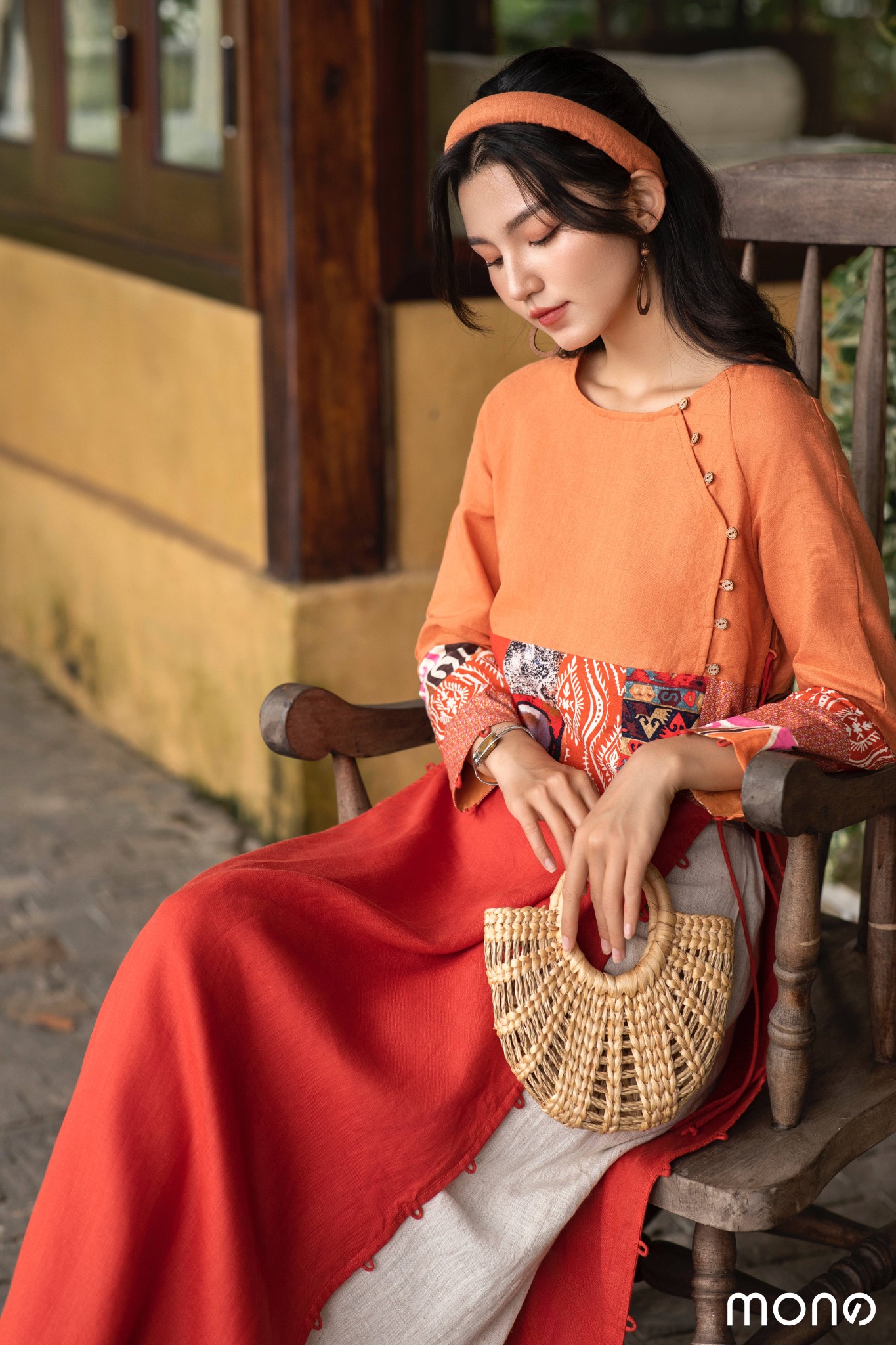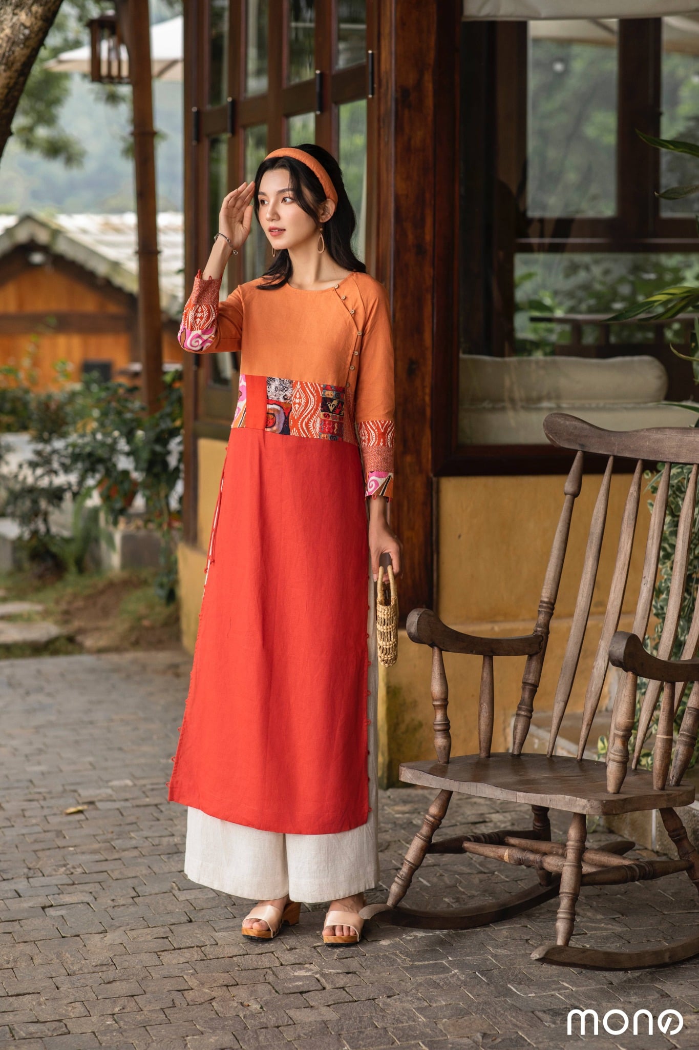 Phối hợp hài hoà hai sắc độ màu sắc, áo dài K’Tay ấn tượng với chi tiết can chắp vùng eo như chiếc thắt lưng bản lớn có thể thay đổi size (chiết hoặc nới rộng eo) với chi tiết đan dây cạnh hông. Chiếc áo thể hiện tinh thần bất đối xứng với hàng cúc lệch một bên và chi tiết can chắp hai ống tay khác biệt.