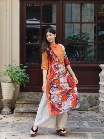 Mẫu áo dài cách tân độc đáo với cổ tàu, tay lửng, eo được nhấn nhẹ và tà ngắn vừa phải. Dễ mặc và phù hợp với mọi dáng người.