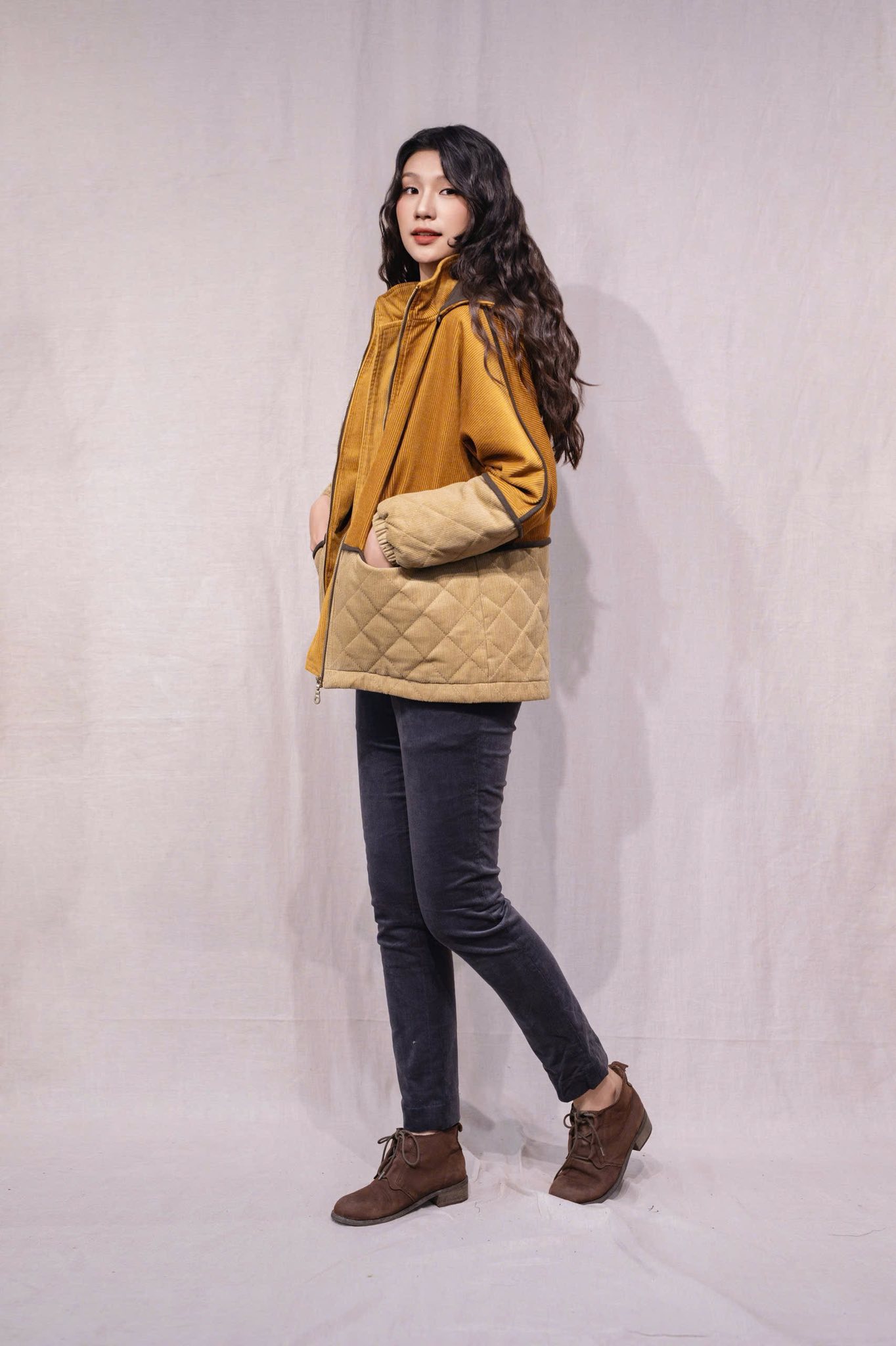 Dáng áo khoác dáng rộng, tay liền, dài.