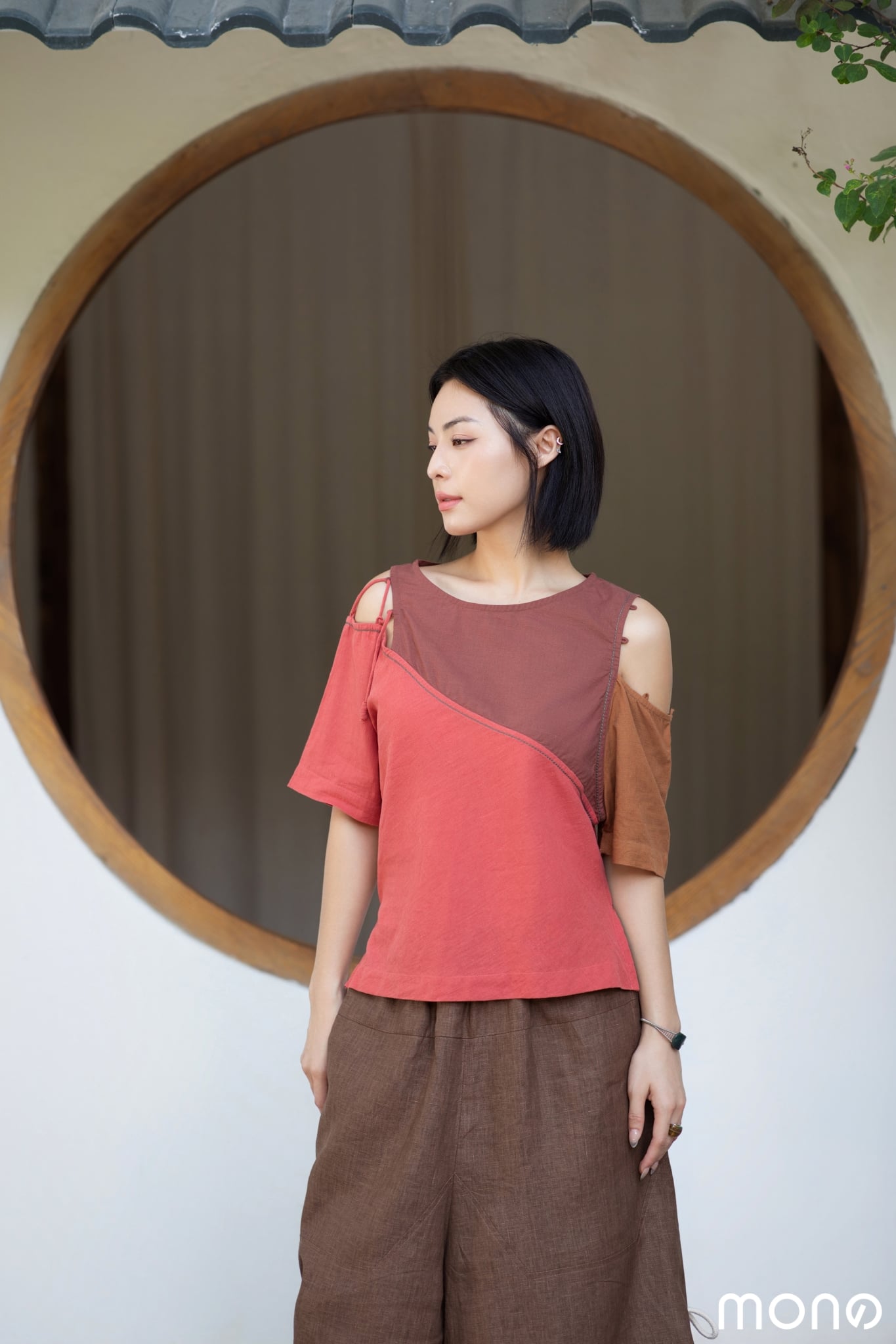 Áo kiểu cộc tay cổ tròn được phối chéo hai mảng màu khác nhau tạo hiệu ứng chuyển màu thú vị. Chi tiết đan dây vai lệch một bên tạo vẻ nữ tính nhưng không kém phần cá tính, chi tiết này có thể linh hoạt thay đổi độ mở tuỳ theo ý thích của người mặc. Áo xẻ nhẹ bên hông tăng phần phóng khoáng và thoải mái.