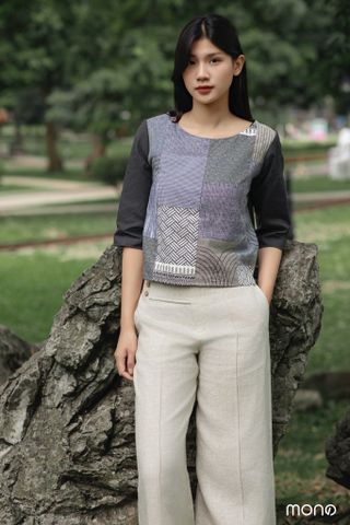 Chiếc áo tay lỡ được can chắp với họa tiết ngẫu hứng từ hai gam màu ghi và be – những tông màu truyền thống mà lại không bao giờ lỗi mốt. Sự kết hợp hài hòa này giúp mang đến vẻ đẹp thanh nhã, trầm lặng nhưng vẫn cuốn hút một cách riêng biệt.