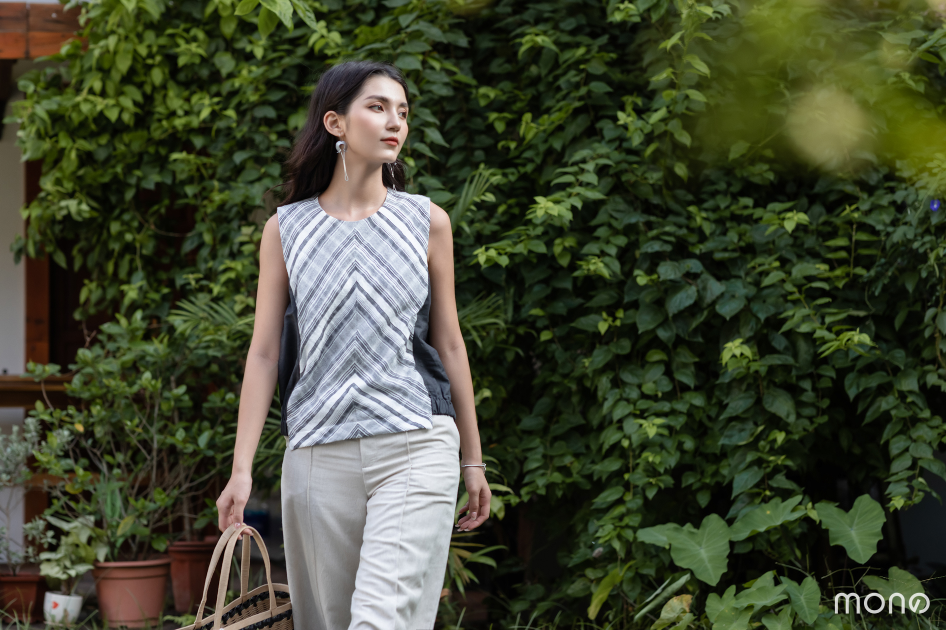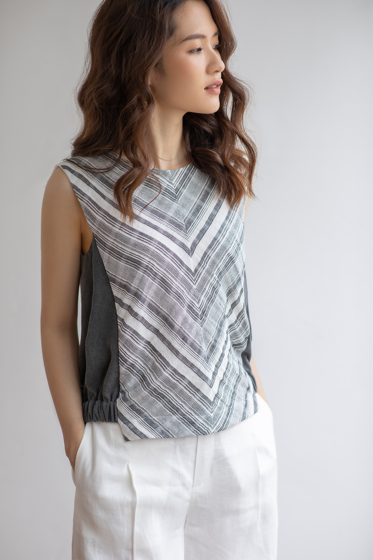 Áo sát nách cổ tròn có khuy sau dễ mặc. Vải kẻ chéo đối xứng 2 bên có tác dụng làm gọn khuôn mặt và khiến người thon thả.
