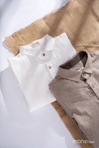 Mẫu sơ mi dài tay cổ đức cơ bản với cúc áo gỗ và túi may lộ trước ngực