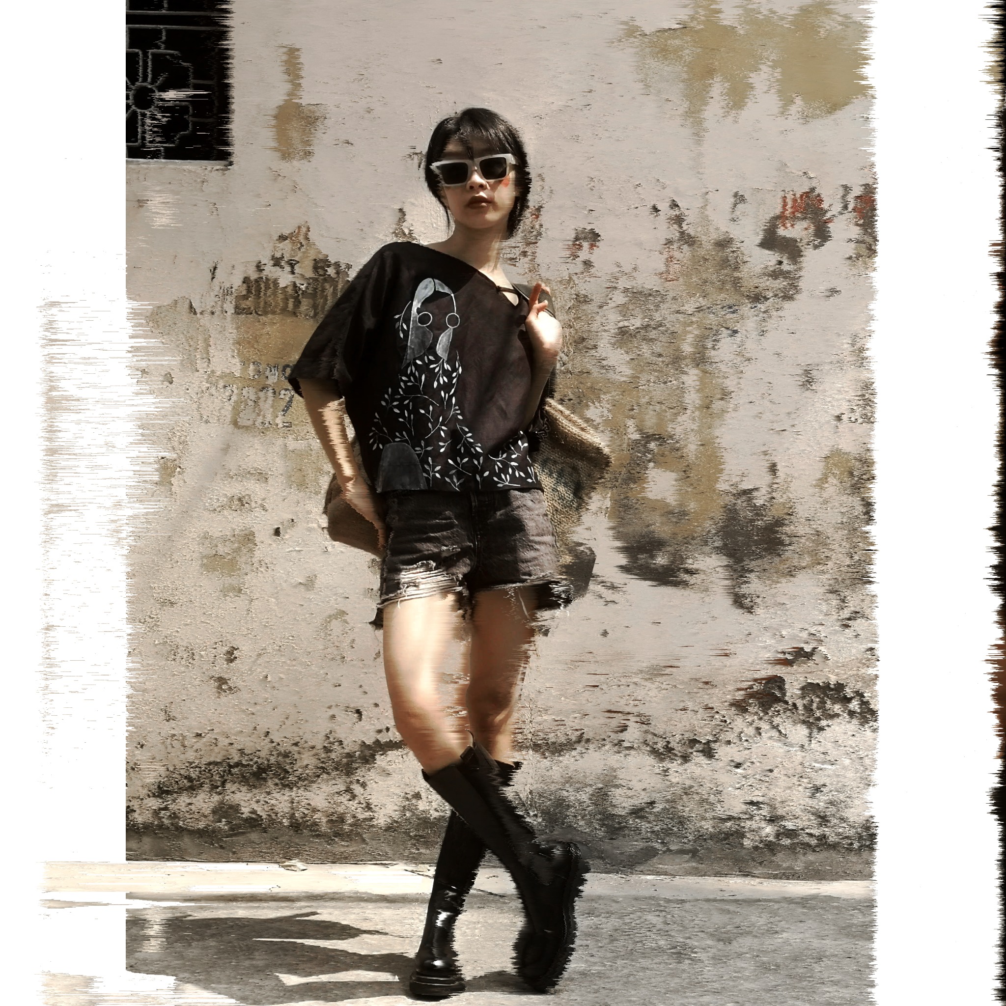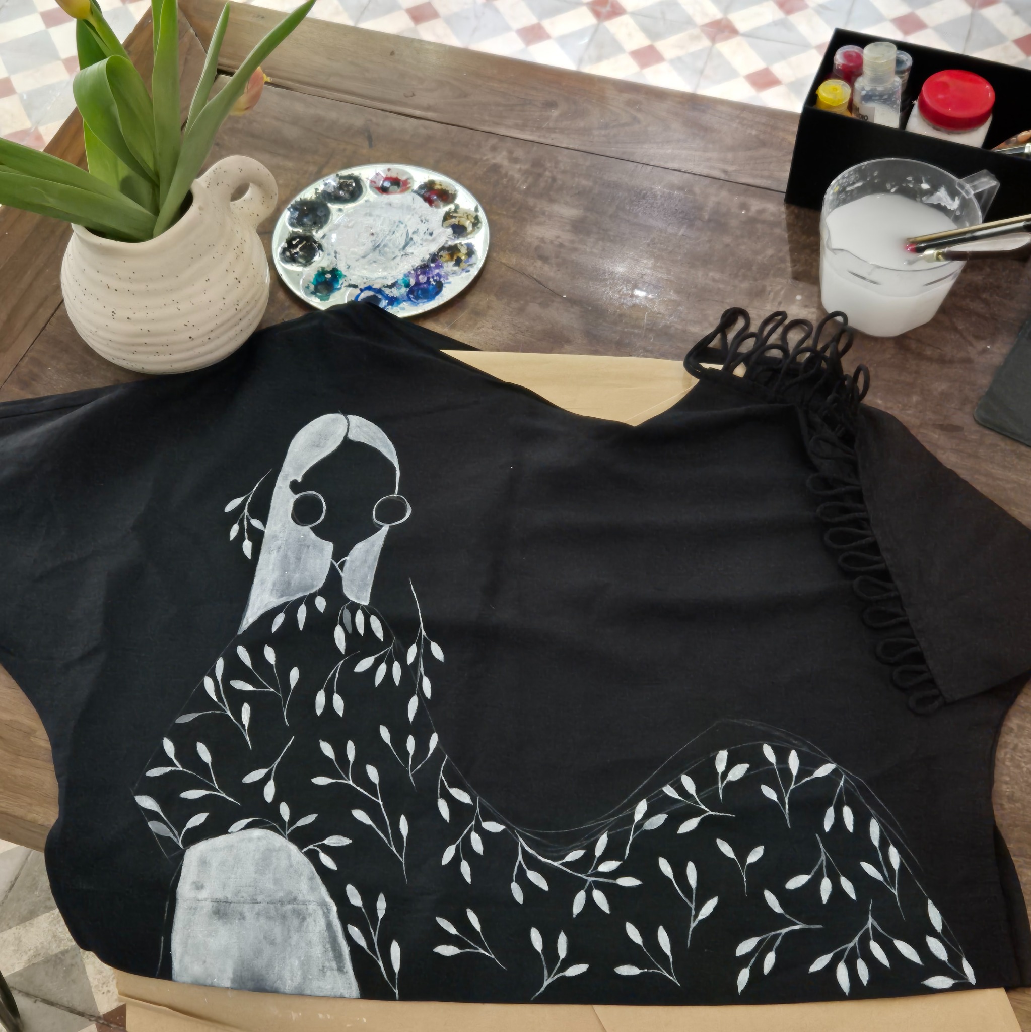 Áo tay lửng được thiết kế cắt cúp cách điệu cùng phần tết sam độc đáo. Hình vẽ tay họa tiết độc đáo trên nền vải linen trắng, giúp chiếc áo trở nên độc đáo và cá tính