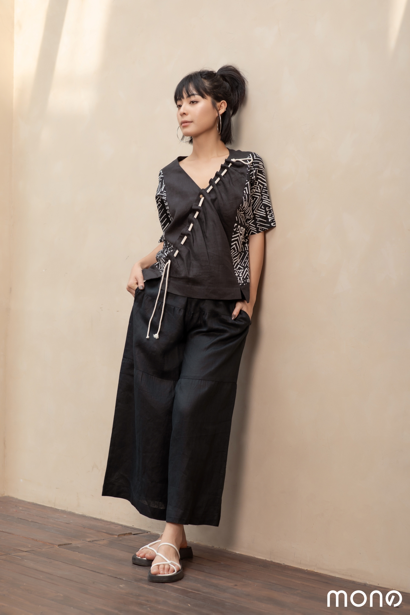 Quần ba tầng được thiết kế ống rộng, điểm nhấn ở phần may nhún dưới cạp và giữa ống, vừa tôn được dáng lại có vẻ mềm mại.