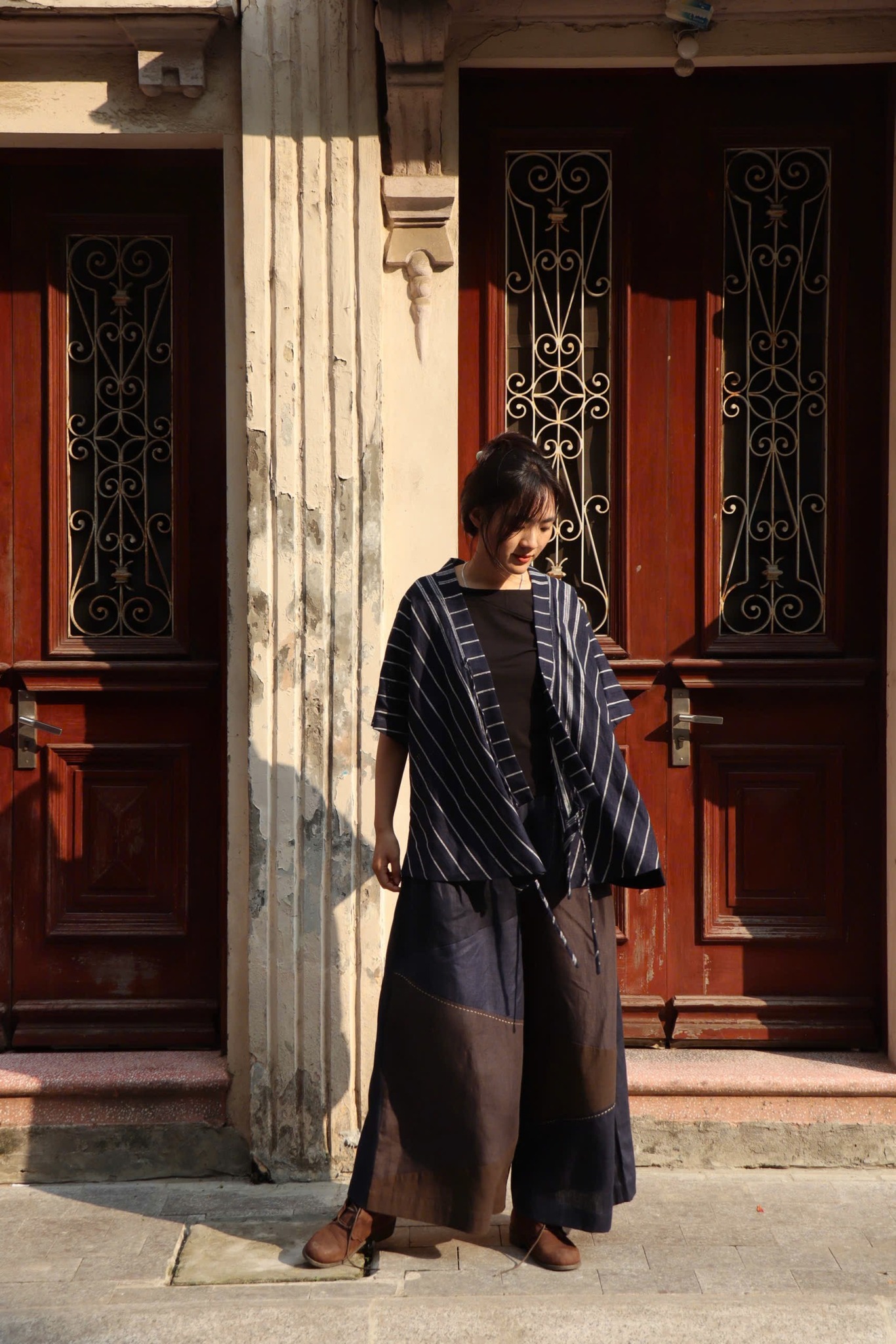 Quần ống rộng dáng dài, lưng chun, can chắp 4 màu thân trước,thân sau quần màu navy, khâu đột chỉ thủ công 2 bên ống quần.