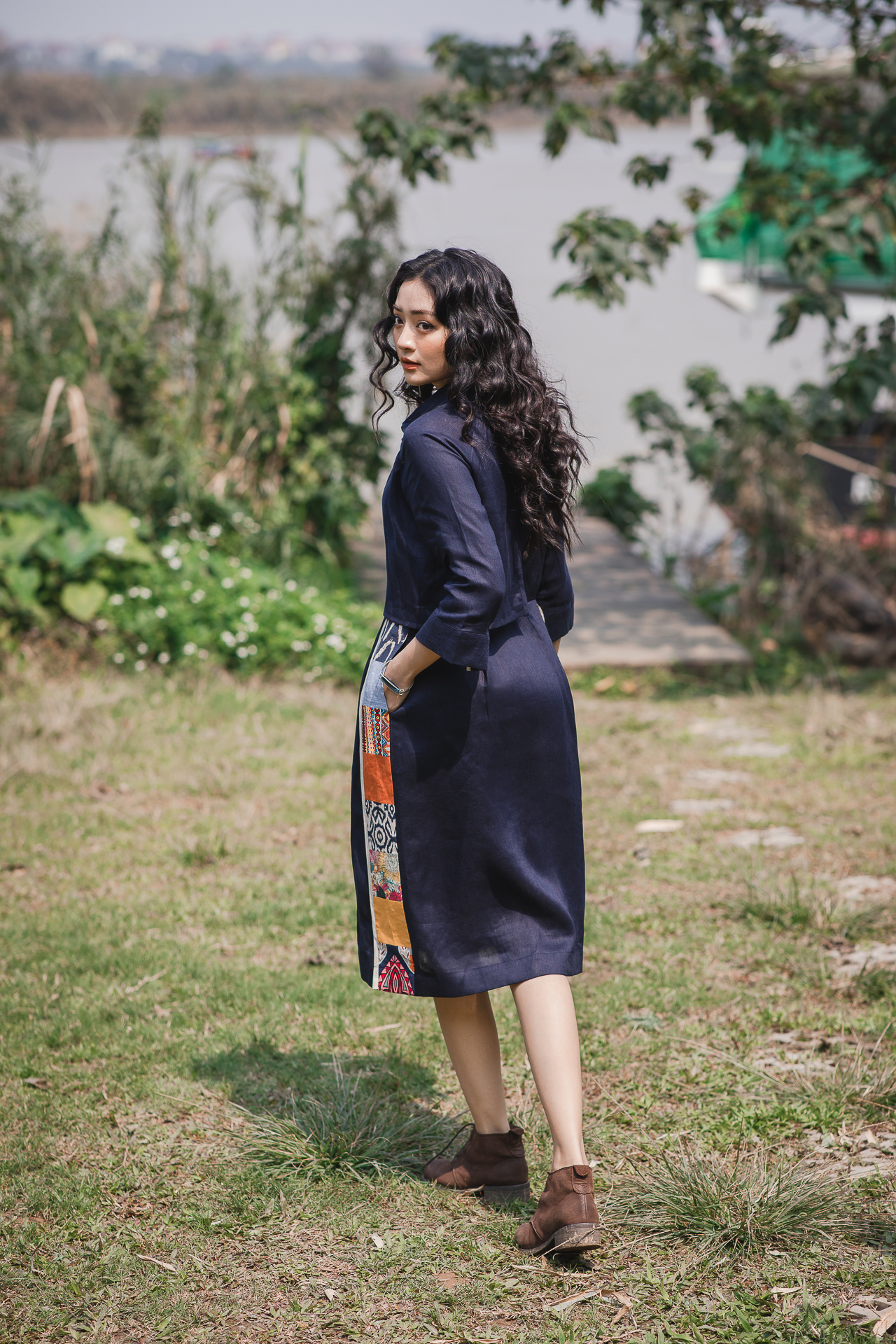 Thiết kế layer, tạo kiểu đặc biệt. Sản phẩm phối mảng can ở gấu áo và dọc thân váy nổi bật. Sản phẩm có thể mặc theo dáng váy cài cúc hoặc áo khoác nhẹ dáng dài.
