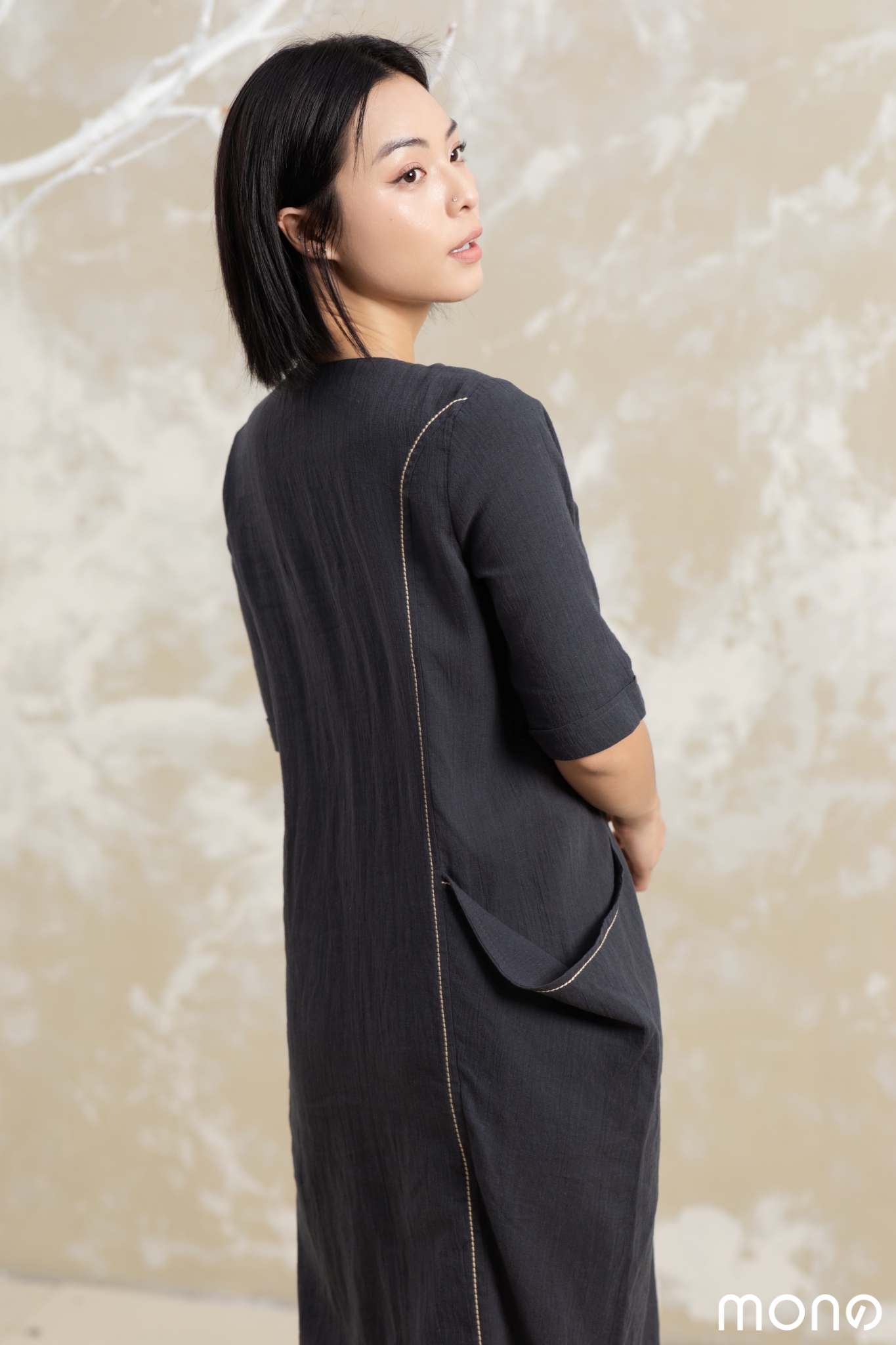 Váy liền thân dáng suông thư thả cùng chất liệu linen bamboo mới lạ đem đến sự thoải mái cho người mặc.