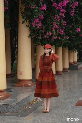 Váy nhung dáng A dài 2 lớp với tông màu cam đỏ nâu trầm tinh tế, thiết kế can chắp tùng nhiều màu tạo điểm nhấn nổi bật. Tay dài bồng cửa tay bằng vải linen lụa mềm mại, cổ tàu thanh lịch, và khuy giữa dài giúp mặc dễ dàng. Dây rút eo tinh tế giúp thu gọn dáng, mang đến sự thoải mái và tự tin cho người mặc.
